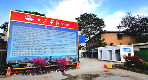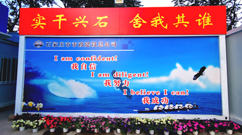 中央商務(wù)區(qū)正太廣場(chǎng)項(xiàng)目部,根據(jù)現(xiàn)場(chǎng)實(shí)際情況及廣場(chǎng)圖紙,因地制宜,利用原地道橋位置進(jìn)行簡(jiǎn)約化設(shè)計(jì),占地東西長(zhǎng)40米,南北寬20米。麻雀雖小五臟俱全,項(xiàng)目布局充分利用移動(dòng)板房外立面做文化設(shè)計(jì),用作公司簡(jiǎn)介宣傳墻、食堂文化宣傳墻及旗桿背景墻。項(xiàng)目部除辦公區(qū)外,還設(shè)置了餐廳、獨(dú)立衛(wèi)生間、淋浴間等生活設(shè)施以及微景觀種植園等休閑場(chǎng)所,整個(gè)項(xiàng)目部簡(jiǎn)約而不簡(jiǎn)單,注重以人為本,盡可能提高項(xiàng)目部人員工作、生活水平,激發(fā)了干部職工干事創(chuàng)業(yè)的激情,為推進(jìn)項(xiàng)目建設(shè)提供了有力支撐。