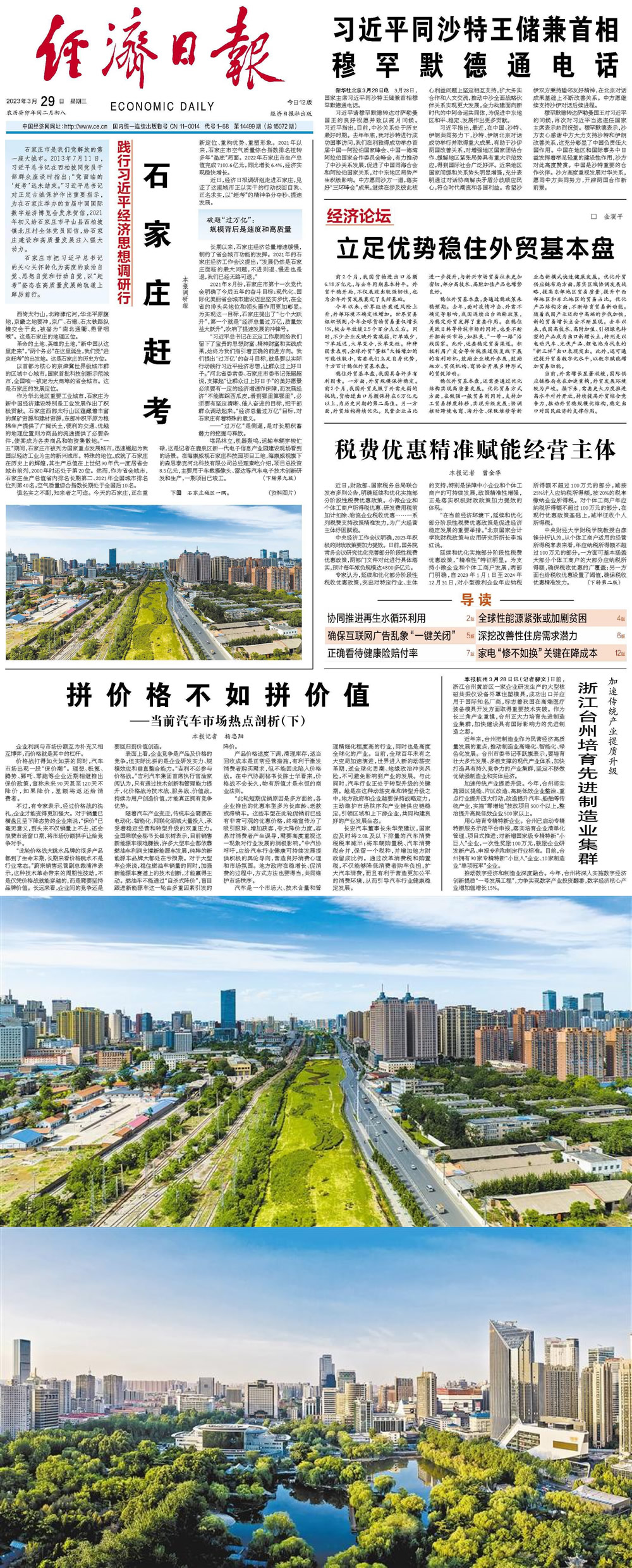 | 石家莊市是我們黨解放的第一座大城市。2013年7月11日,習近平總書記在西柏坡同黨員干部群眾座談時指出:“黨面臨的‘趕考’遠未結束!绷暯娇倳泴φü懦潜Wo作出重要指示,為在石家莊舉辦的首屆中國國際數(shù)字經濟博覽會發(fā)來賀信,2021年初又給石家莊市平山縣西柏坡鎮(zhèn)北莊村全體黨員回信,給石家莊建設和高質量發(fā)展注入強大動力。 石家莊市把習近平總書記的關心關懷轉化為高度的政治自覺、思想自覺和行動自覺,以“趕考”姿態(tài)在高質量發(fā)展的軌道上踔厲前行。 西倚太行山,北跨滹沱河,華北平原腹地,京畿之地要沖,京廣、石德、石太鐵路縱橫交會于此,被譽為“南北通衢、燕晉咽喉”。這是石家莊的地理區(qū)位。 革命的土地、英雄的土地,“新中國從這里走來”,“兩個務必”在這里誕生,我們黨“進京趕考”的出發(fā)地。這是石家莊的歷史方位。 以首都為核心的京津冀世界級城市群的區(qū)域中心城市,國家首批科技創(chuàng)新示范城市,全國唯一被定為大商埠的省會城市。這是石家莊的發(fā)展定位。 作為華北地區(qū)重要工業(yè)城市,石家莊為新中國經濟建設特別是工業(yè)發(fā)展作出了積極貢獻。石家莊西部太行山區(qū)蘊藏著豐富的煤礦資源和建材資源,東部沖積平原為糧棉生產提供了廣闊沃土,便利的交通、優(yōu)越的地理位置則為商品的流通提供了必要條件,使其成為各類商品和物資集散地!耙晃濉逼陂g,石家莊市被列為國家重點發(fā)展城市,迅速崛起為我國以輕紡工業(yè)為主的新興城市。特殊的地位,成就了石家莊在歷史上的輝煌,其生產總值在上世紀90年代一度居省會城市前列,2000年時還處于第20位。然而,作為省會城市,石家莊生產總值省內排名長期第二、2021年全國城市排名位列第40名,空氣質量綜合指數(shù)長期處于全國后10名。 懼名實之不副,知來者之可追。今天的石家莊,正在重新定位、重構優(yōu)勢、重塑形象。2021年以來,石家莊市空氣質量綜合指數(shù)排名扭轉多年“墊底”局面。2022年石家莊市生產總值完成7100.6億元,同比增長6.4%,經濟實現(xiàn)穩(wěn)快增長。 近日,經濟日報調研組走進石家莊,見證了這座城市正以實干的行動找回自我、正名求實,以“趕考”的精神爭分奪秒、提速發(fā)展。 破題“過萬億”: 規(guī)模背后是速度和高質量 長期以來,石家莊經濟總量增速緩慢,制約了省會城市功能的發(fā)揮。2021年的石家莊經濟工作會議提出:“發(fā)展仍然是石家莊面臨的最大問題,不進則退、慢進也是退,我們已經無路可退! 2021年8月份,石家莊市第十一次黨代會明確了今后五年的奮斗目標:現(xiàn)代化、國際化美麗省會城市建設邁出堅實步伐,在全省的排頭兵地位和領頭雁作用更加彰顯。為實現(xiàn)這一目標,石家莊提出了“七個大躍升”,第一個就是“經濟總量過萬億,質量效益大躍升”,吹響了提速發(fā)展的沖鋒號。 “習近平總書記在正定工作期間給我們留下了寶貴的思想財富、精神財富和實踐成果,始終為我們指引著正確的前進方向。我們提出‘過萬億’的奮斗目標,就是要以實際行動踐行習近平經濟思想,讓群眾過上好日子!焙颖笔∥N⑹仪f市委書記張超超說,支撐起“讓群眾過上好日子”的美好愿景必須要有一定的經濟增速作保障,而發(fā)展經濟“不能腳踩西瓜皮,滑到哪里算哪里”,必須要有堅定清晰、催人奮進的目標,把干部群眾調動起來!敖洕偭窟^萬億”目標,對石家莊有著特殊的意義。 ——“過萬億”是倒逼,是對長期積蓄潛力的挖掘與釋放。 塔吊林立,機器轟鳴,運輸車輛穿梭忙碌,這是記者在鹿泉區(qū)新一代電子信息產業(yè)園建設現(xiàn)場看到的場景。在?低暿仪f科技園項目工地,?低暺煜碌纳继┛撕颖笨萍加邢薰究偨浝砬匾俳榻B,項目總投資8.5億元,主要用于車載攝像頭、雷達等汽車電子技術創(chuàng)新研發(fā)和生產,一期項目已竣工。 石家莊市委副秘書長、市委研究室主任趙建海為記者分析了實現(xiàn)“過萬億”目標的底氣:京津冀協(xié)同發(fā)展為石家莊承接首都產業(yè)轉移和科技成果轉化提供了大好機遇;“一帶一路”建設為石家莊發(fā)揮商埠優(yōu)勢開拓國際市場提供了提速的動力。其他生產總值超萬億元省會城市的發(fā)展歷程也為石家莊提供了借鑒,這些城市生產總值到達6000億元后,都在5年內超過了萬億元。同時,石家莊工業(yè)基礎雄厚,工業(yè)產業(yè)門類涵蓋了41個國民經濟行業(yè)分類中的37個。新一代電子信息、生物醫(yī)藥、先進裝備制造、現(xiàn)代食品、現(xiàn)代商貿物流5個產業(yè)有基礎打造千億元產業(yè)集群。 “石家莊過去一段時間雖然發(fā)展緩慢,但也是一個積蓄的過程。‘過萬億’目標是石家莊市委、市政府進行深入調研、縝密分析和綜合研判后確定的,是‘跳出石家莊看石家莊’作出的,是對過去積蓄潛力的挖掘與釋放!壁w建海說。 ——“過萬億”是催化劑,提升的不僅是發(fā)展速度,也包括干部群眾的“精氣神”。 目標確定之后,干部就是決定性因素。 3月7日,一場別開生面的城市更新項目調研活動在石家莊展開,各區(qū)主要負責同志和市直有關部門負責人先后來到橋西區(qū)金世界城市更新項目、石家莊國際農產品批發(fā)交易中心項目、槐安路二三環(huán)連通工程等,實地察看建設進展。
